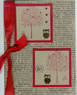 For this card, I stamped the Hero Arts stamp Friend Definition in black on kraft cardstock. I then cut 2 2.25 inch square pieces of red cardstock. I then also cut 2 2 inch pieces of kraft cardstock. On the Kraft cardstock, I stamped the tree and falling leaves in red ink. I stamped the owl and the "Hi" in black ink All the stamps on the squares are from the Hero Arts set "Love That" Sparkle Clear set.. I mounted the kraft stamped squares onto the red squares. I then kitty cornered the red squares on to the Stamped kraft base cardstock. I added three gems to the top square. To finish off the card, I added some red ribbon to the side of the card.